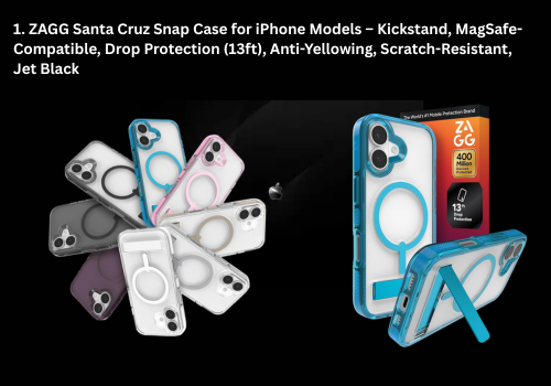 1. ZAGG Santa Cruz Snap Case for iPhone Models – Kickstand, MagSafe-Compatible, Drop Protection (13ft), Anti-Yellowing, Scratch-Resistant, Jet Black