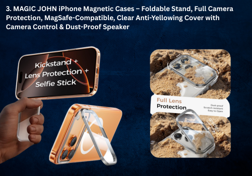 3. MAGIC JOHN iPhone Magnetic Cases – Foldable Stand, Full Camera Protection, MagSafe-Compatible, Clear Anti-Yellowing Cover with Camera Control & Dust-Proof Speaker