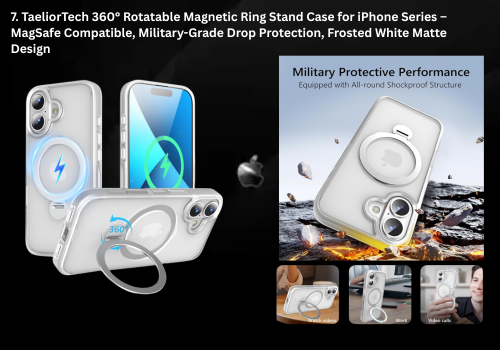 7. TaeliorTech 360° Rotatable Magnetic Ring Stand Case for iPhone Series – MagSafe Compatible, Military-Grade Drop Protection, Frosted White Matte Design