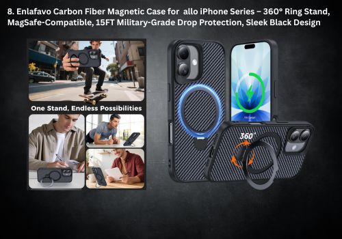 8. Enlafavo Carbon Fiber Magnetic Case for iPhone 17, 16 and more – 360° Ring Stand, MagSafe-Compatible, 15FT Military-Grade Drop Protection, Sleek Black Design